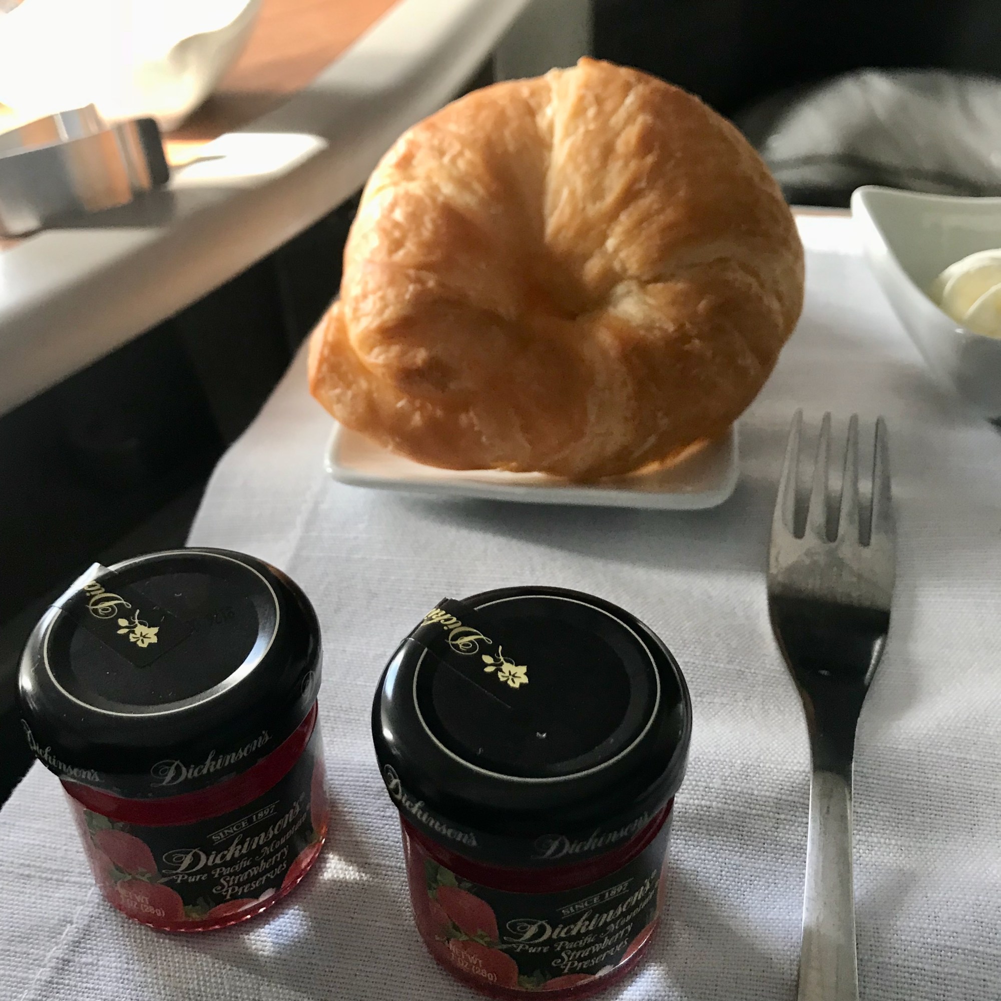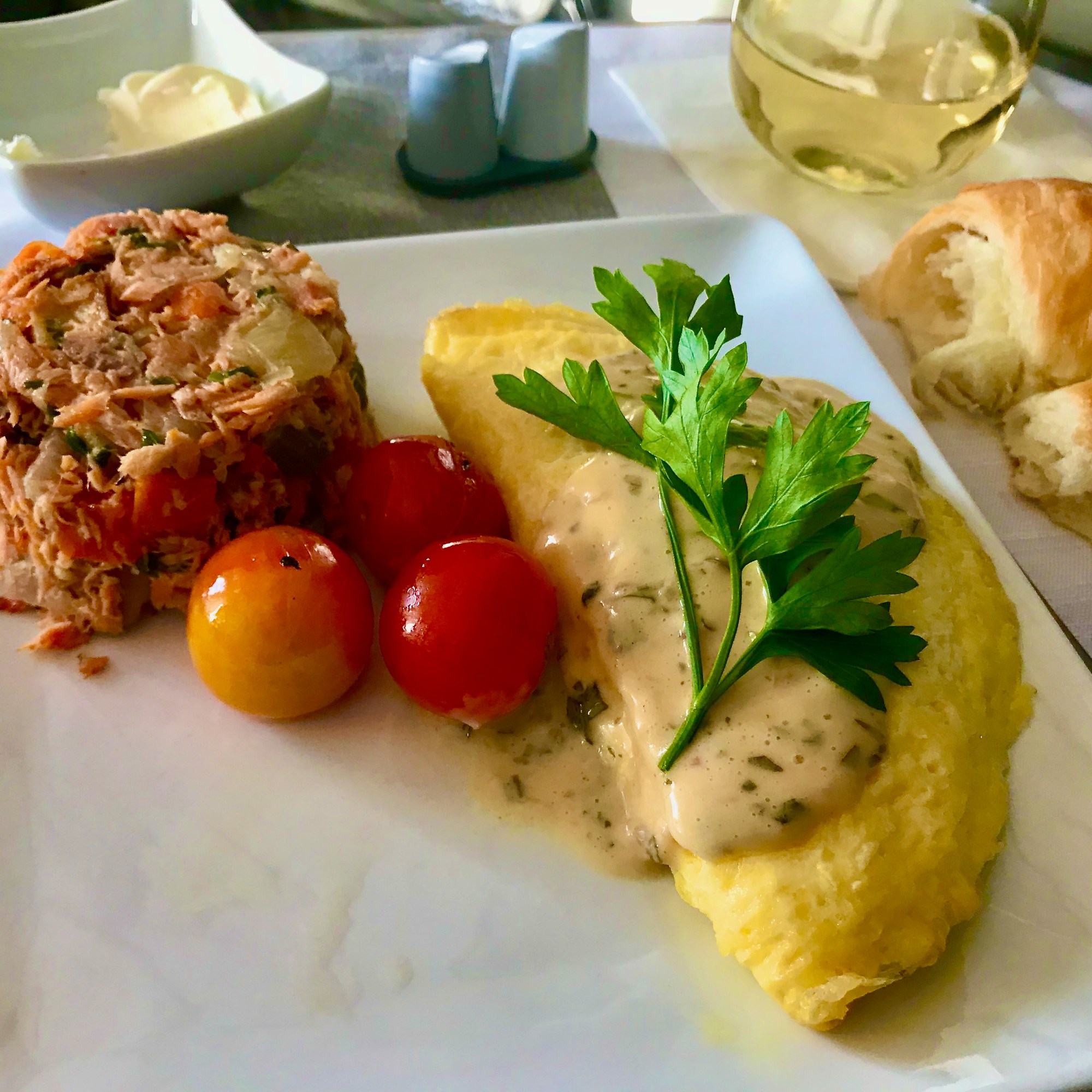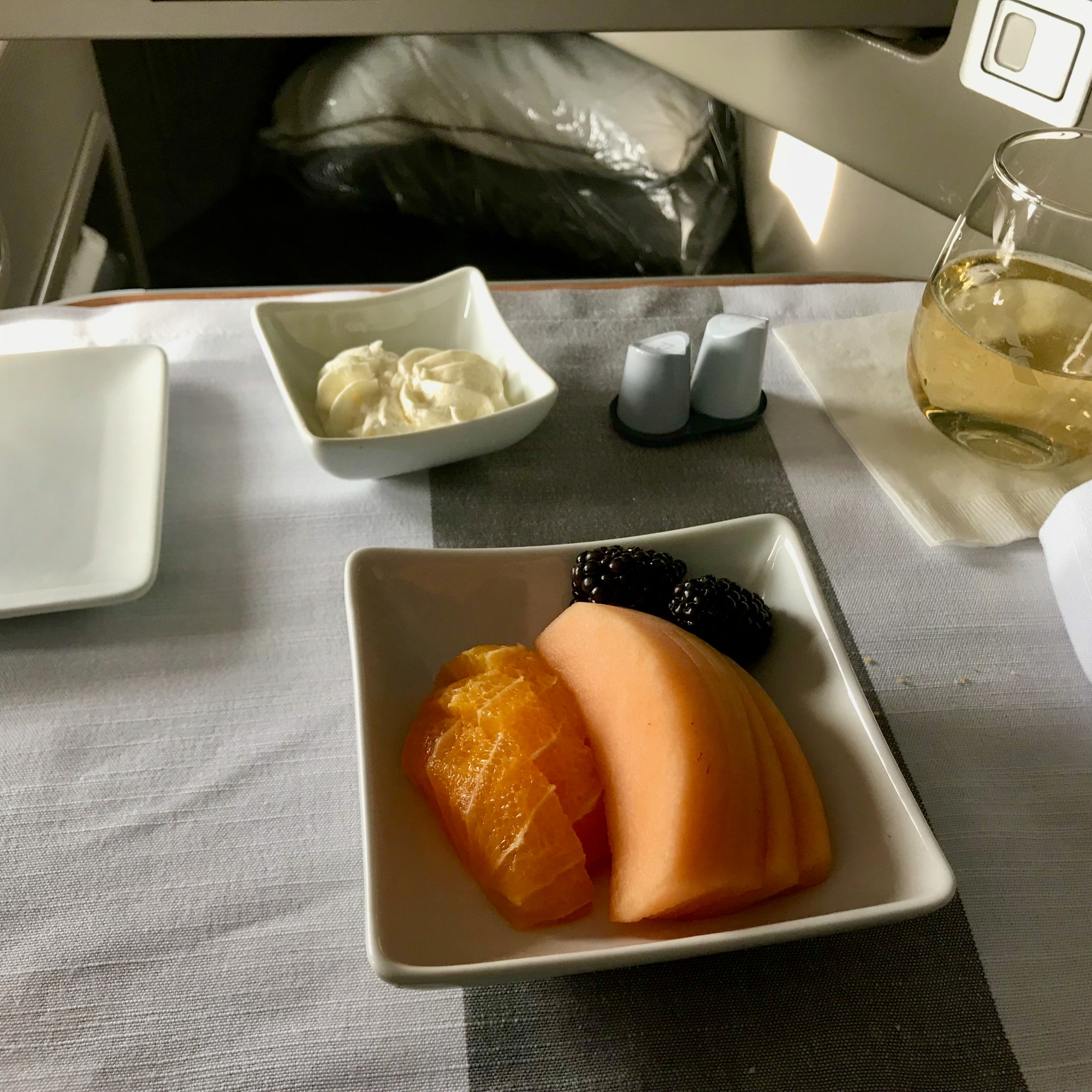I had pre-ordered the omelette but decided to take the Fresh Seasonal Fruit plate to start with, it was a bit early for me to have wine, so I stuck with the champagne, and later had a Bloody Mary. The flight was smooth and I was able to catch up on some more sleep, as we glided our way ever westwards, towards the city of angels and LAX.