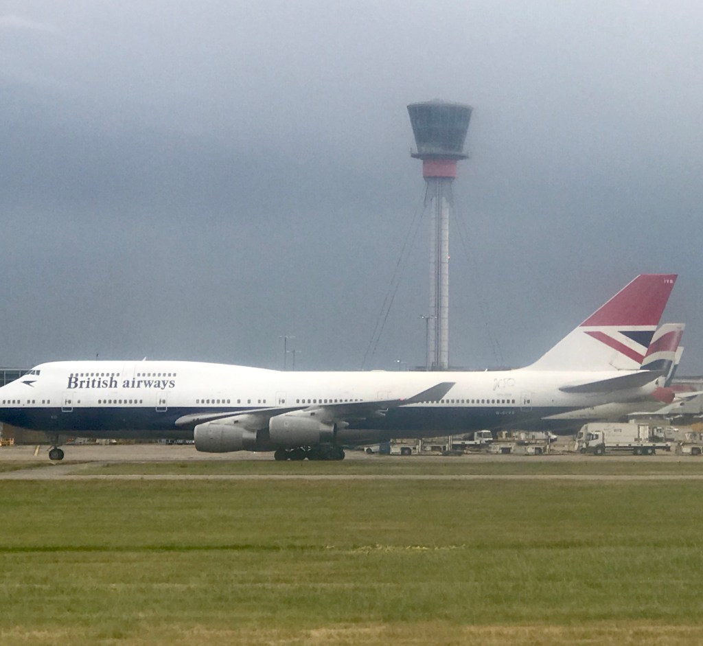 Installed in my seat it soon became clear that we too were not going to leave on time today. Eventually, we were allowed to push back and start our engines and head to the end of Runway 27 L for our takeoff. Today was going to be my day for retro liveries as I spotted this on the way to the end of the runway.