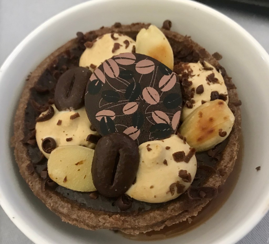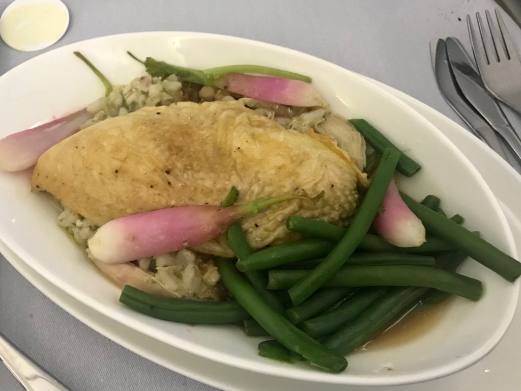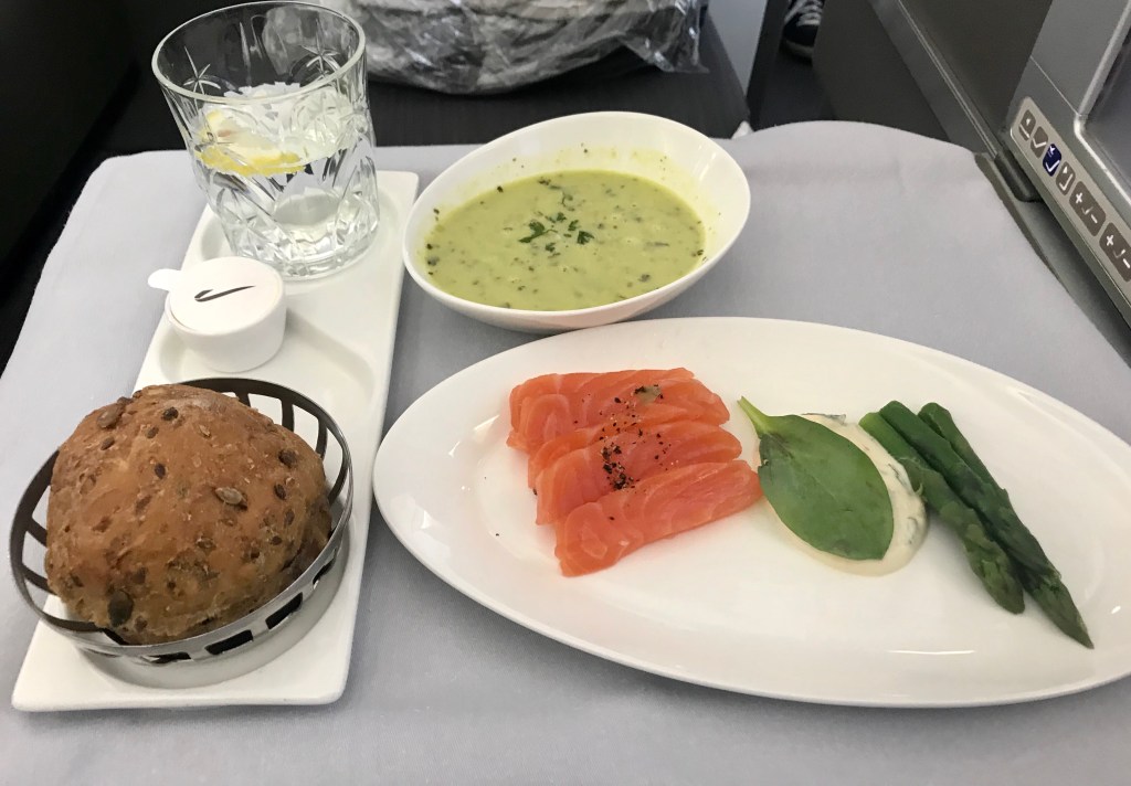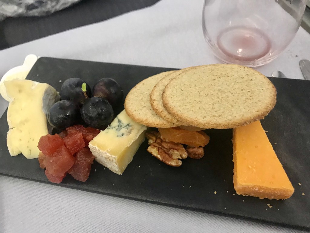 The crew were soon an their feet and offering us our first drinks, a Gin and Tonic please. It was not too long before I had my tray in front of me with the two starters I had ordered, the Salmon and the Soup. Both were excellent. I then had the Chicken main dish and some cheese and the chocolate tart for dessert. I know piggy me, but it was all good.